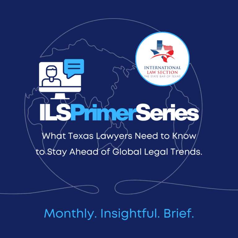 The State Bar of Texas International Law Section is thrilled to announce the launch of our new “ILS Primer Series: What Texas Lawyers Need to Know to Stay Ahead of Global Legal Trends,” free monthly webinars designed to keep Texas attorneys informed on the latest developments in international law. These 30-minute sessions will be held monthly from 12:00-12:30 PM CDT, offering busy practitioners a convenient lunch-hour opportunity to earn 0.5 hours of CLE credit while staying current on global legal trends that impact their practice. Register now for this month’s free CLE!